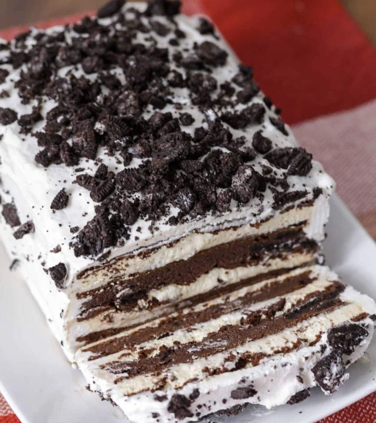 Add the last 4 sandwiches; cover the cake with the remaining whipped cream; add the remaining the chopped cookies to the cake.
