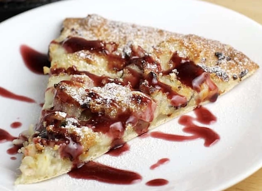 Serve the pizza dusted with powdered sugar and drizzled with the raspberry sauce.