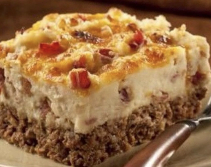 Stir in bacon crumbles and fried onions; spread evenly on top of beef mixture. Sprinkle on the shredded cheese.