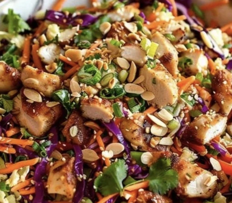 In a large bowl, combine the green cabbage, red cabbage, carrot, red bell pepper, fresh cilantro, green onions, almonds, and chow mein noodles.