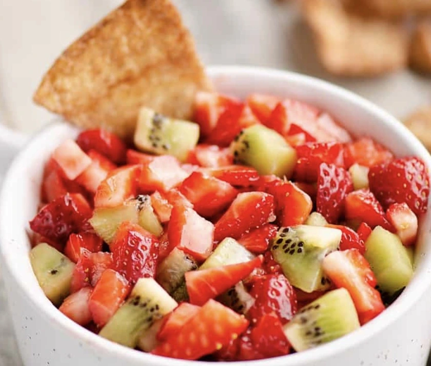 This fruit salsa is the perfect summer snack or dessert. It's light and sweet and is tossed with freshly squeezed lime juice and served with cinnamon sugar chips.