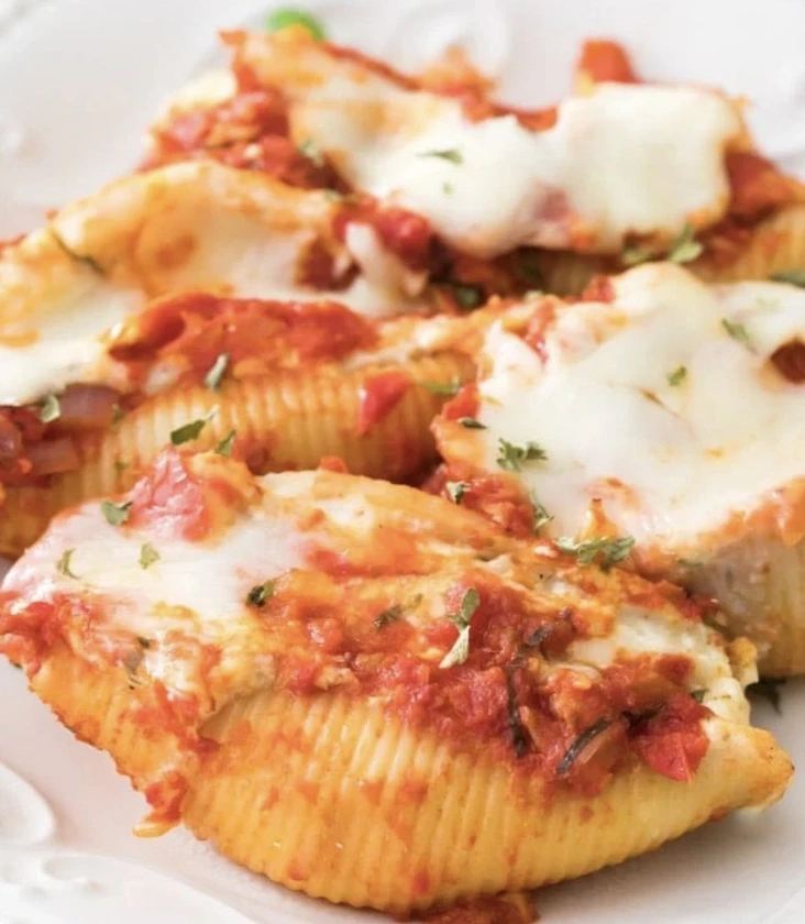 Prepare filling by stirring together Ricotta cheese, 1 1/2 c. Mozzarella cheese, 1/3 c. Parmesan cheese, cream cheese, egg, parsley, garlic, oregano, salt, and ground pepper until well-combined. Spoon into the prepared shells.