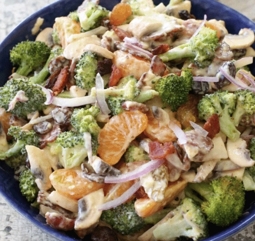 This is an irresisitible salad made with crisp, toasted broccoli, bacon, mushrooms, red onion and mandarin oranges. It's tossed in a slightly sweet homemade dressing. It's perfect for holidays, get togethers, or even your everyday salad.