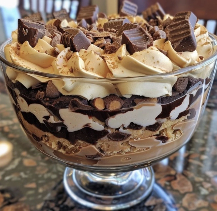Layer one-third of the brownies in a large glass dish. Sprinkle half of the peanut butter cups and one-third of the pudding mixture on top. Repeat the layers.