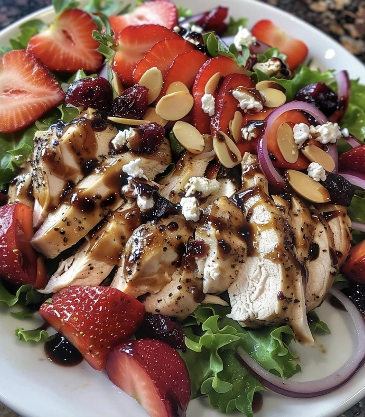 In a large bowl, toss the chopped chicken, romaine lettuce, strawberries, dried cranberries, red onion slices, crumbled goat cheese, and sliced almonds together; stir.