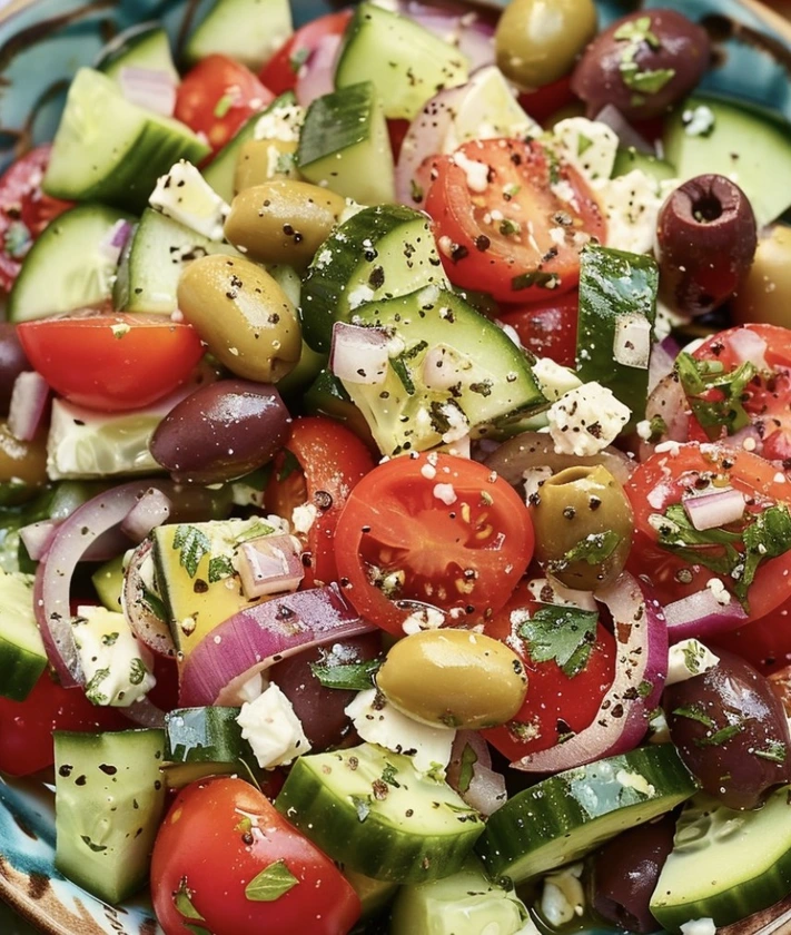 Not only is this Mediterranean salad delicious, it's healthy with crunchy, vibrant veggies. You could serve it as described or on a bed of your favorite greens or lettuce.