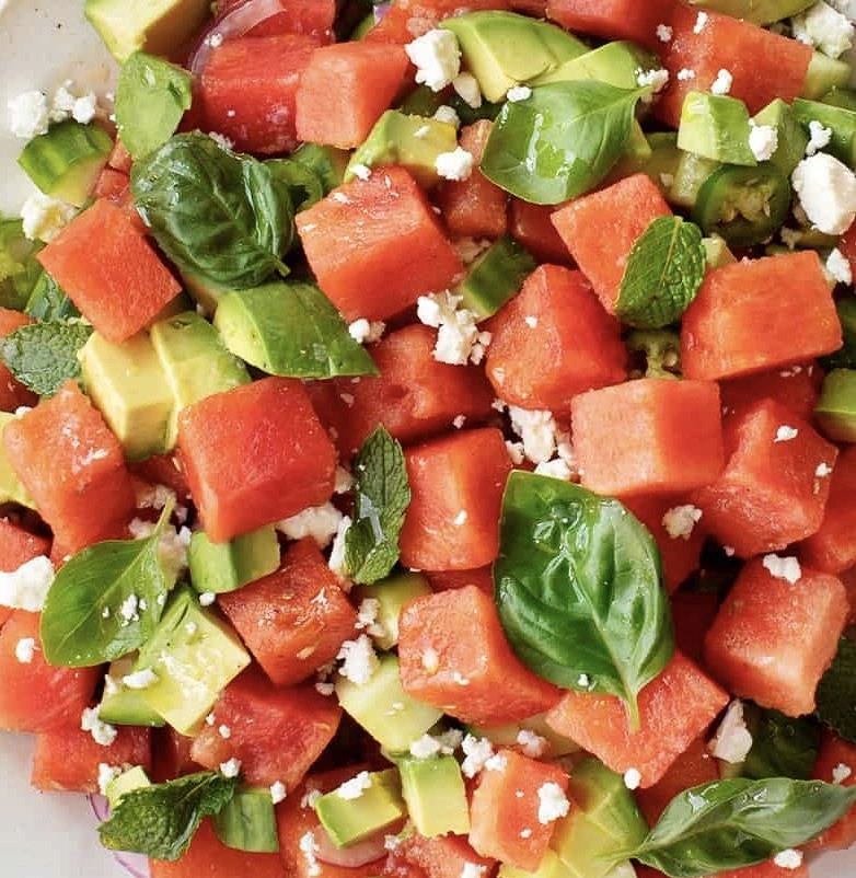 This light and refreshing salad will become a new summer favorite on a hot day. It's made with watermelon, feta cheese, onion, cucumber and a serrano or jalapeño pepper for a little bit of a kick.