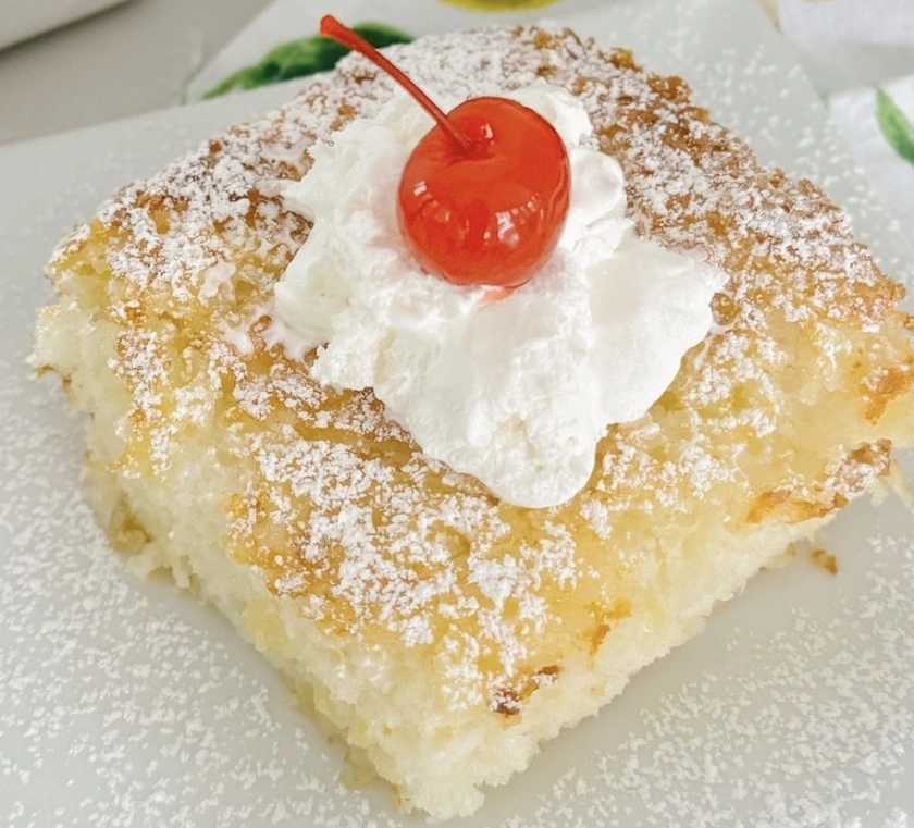The cake is delicious on its own but is also delicious with your choice of toppings. Dust with powdered sugar on top, Cool Whip, marachino cherries, pineapple slices or coconut flakes.