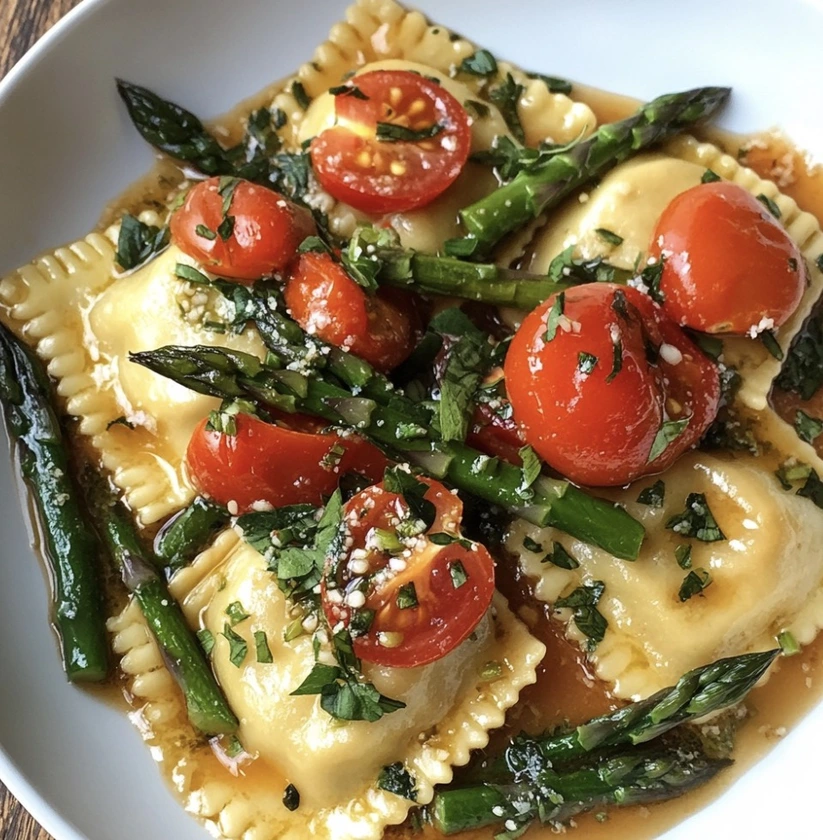 Cheese Ravioli with Tomatoes, Asparagus, Garlic, and Herbs
