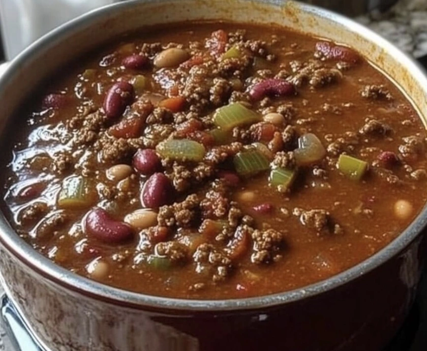 Add the beef and the remaining ingredients to a 6 qt. pot. Cover; let the chili simmer for 1 to 1 1/2 hours, stirring every 15 minutes.