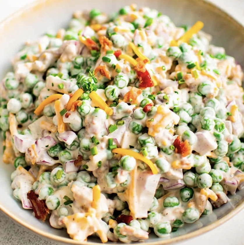 This pea salad is creamy and flavorful, with sweet peas, chopped bacon or ham, Cheddar cheese, green onions, mayonnaise and lots of wonderful seasonings. Serve it as a side dish at your next gathering or meal.