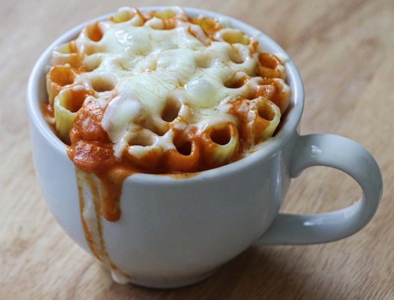 Add 2 T. marinara sauce in the bottom of a large, oven-safe mug. Top with a sprinkle of Mozzarella cheese, basil, and another 2 T. marinara sauce.