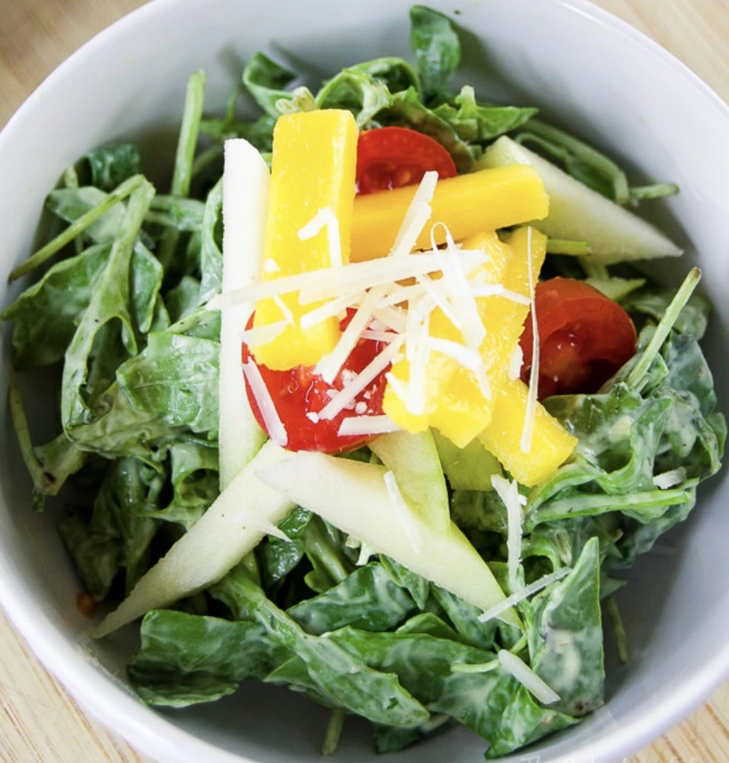 Enjoy this light, healthy salad for lunch or as part of dinner. It's filled with fresh mango, Honeycrisp apples, Parmesan Reggiano cheese, and lots of arugula. It's served with Honey Avocado and Thyme salad dressing.