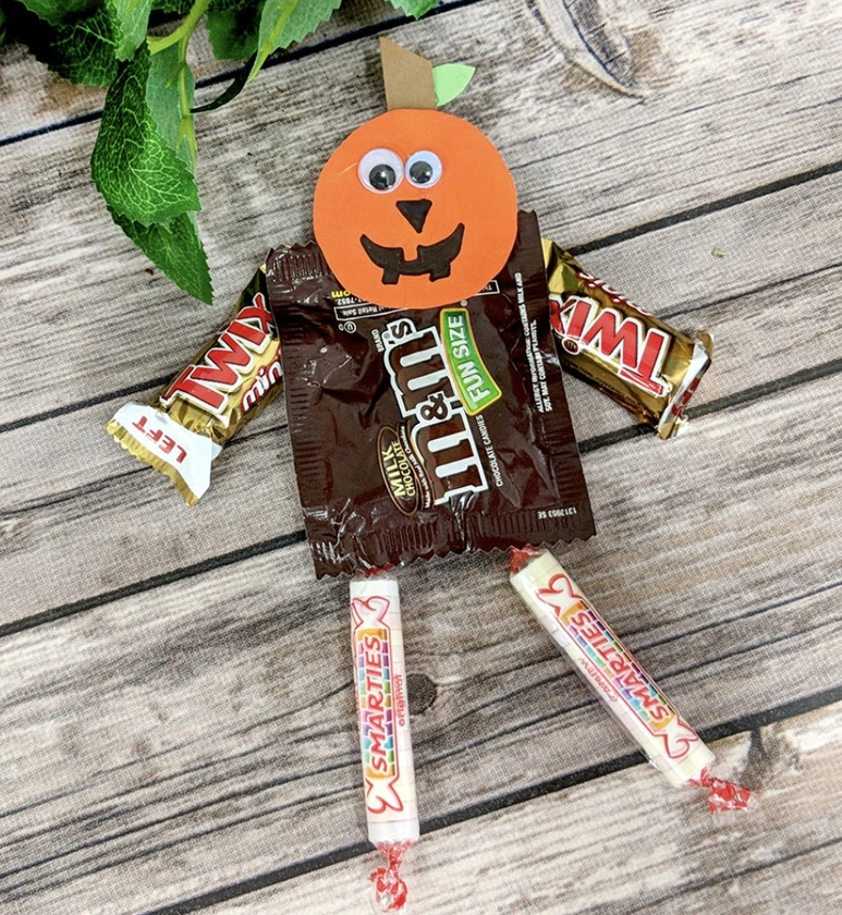 Glue on 2 Mini Twix to the top sides of the M&M packet or Skittles packet for arms.
