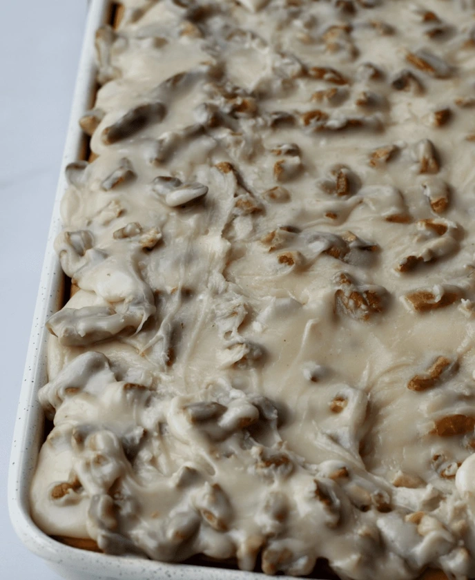 Take that white or yellow boxed cake mix to a higher level with this amazing recipe. This sheet cake is made with the cake mix, egg whites, milk, butter and vanilla extract and slathered with a celicious butter pecan icing.