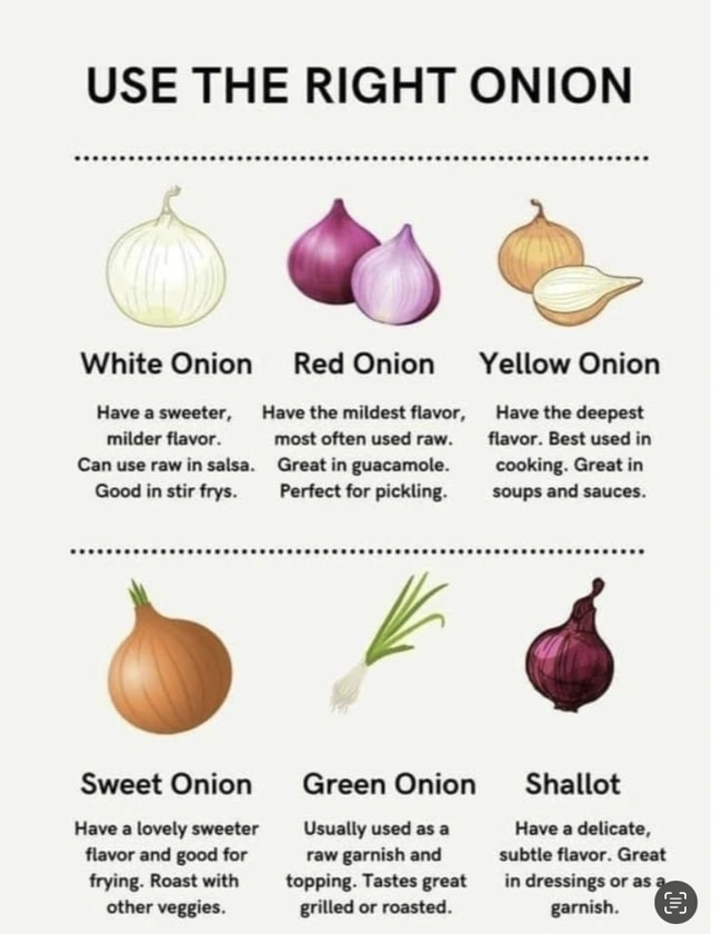 Follow chart on when to use each onion.