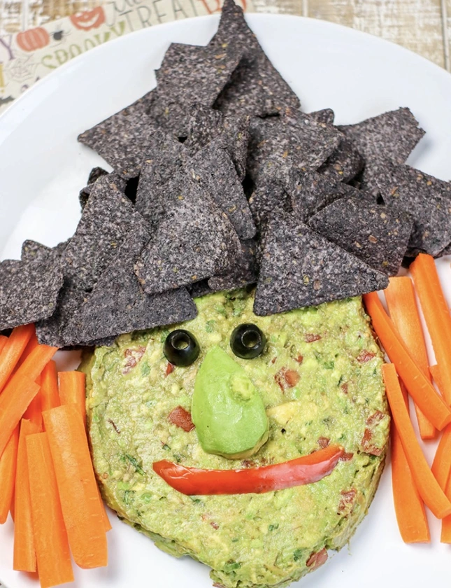 Don't just serve guacamole and chips during this spooky season, make it fun by using the guacamole as a witch's face and arranging veggies and blue chips around it.