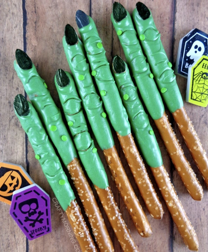 While the candy melts are still slightly wet, take a toothpick and draw lines onto the witches fingers to create knuckles. Add green sprinkles while the candy melts are still wet to create warts, if desired.