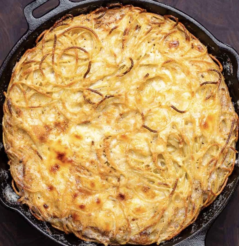 Add the butter and oil to the hot skillet; spread out in the pan. Add the spaghetti mixture; cook for 1 minute without stirring; remove from the heat.