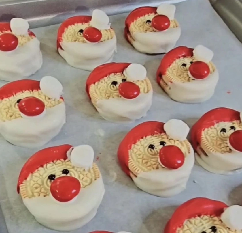 Dip half of each Oreo cookie into the red candy melts to create Santa’s hat. Let them cool and harden on the prepared baking sheet.