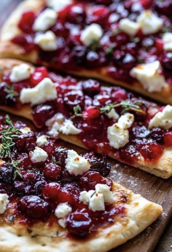 Impress family and guests with this delicious and easy to make appetizer, snack or light meal. The cranberries provide the tart goodness, the goat cheese provides tangy cheese all on top of a crispy flatbread.