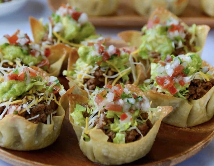 Divide the the taco meat evenly among the wonton cups. Top with the cheese, lettuce, and a dollop of guacamole, salsa and sour cream.