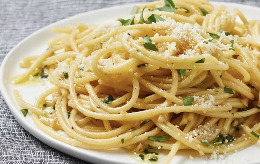 Meanwhile, in a large pan or skillet, heat olive oil over medium-low. Add garlic; cook, stirring frequently, until golden brown, about 3 minutes. Add red pepper flakes and a pinch of salt and pepper. Add drained spaghetti; toss, adding pasta water, a little at a time, until spaghetti is thoroughly coated.