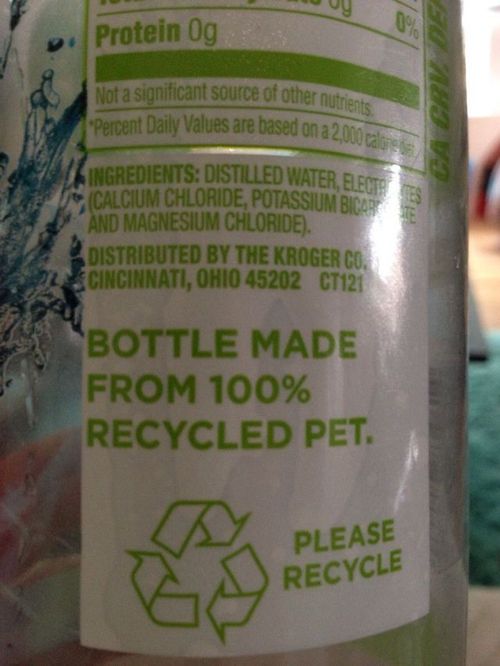 This bottle claims that it was made from 100% recycled pet. I wonder what kind of pet this is. A dog? A goldfish? A cat? Either way, I would not want to be drinking from this bottle.