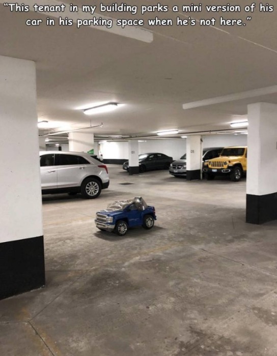 This tenant in my building parks a mini version of his car in his parking space when he's not here.