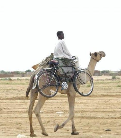 This year I took a trip down to Egypt and thats where I seen this man riding a camel with a bike accessories on the side.
