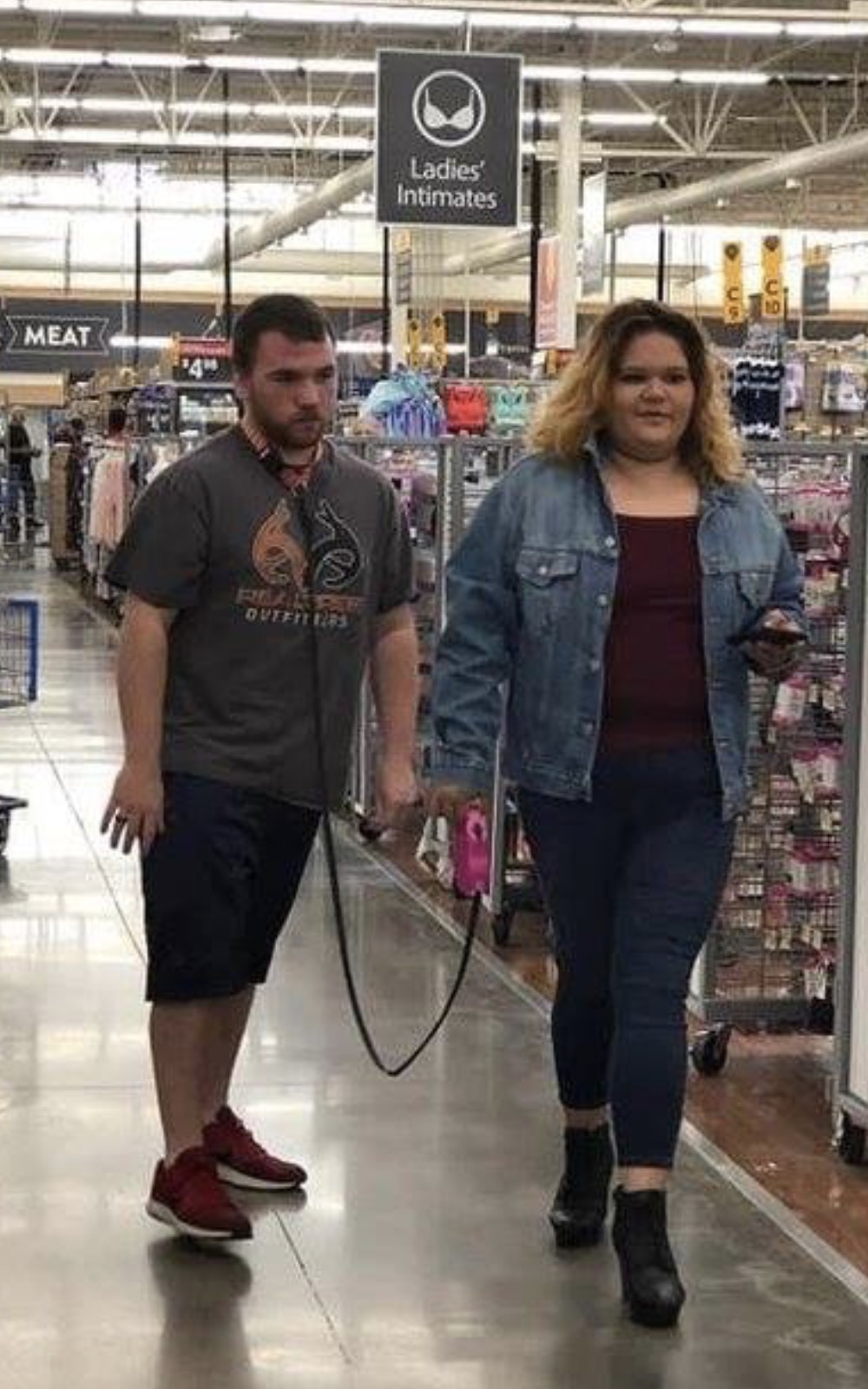 Ladies intimates and meat. I hope that leash isn't too tight around his neck.