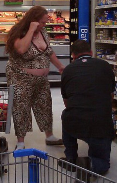 Welcome to the jungle of Walmart. There is love in the air and you can see it! Getting down on one knee is so romantic next to the canned goods.