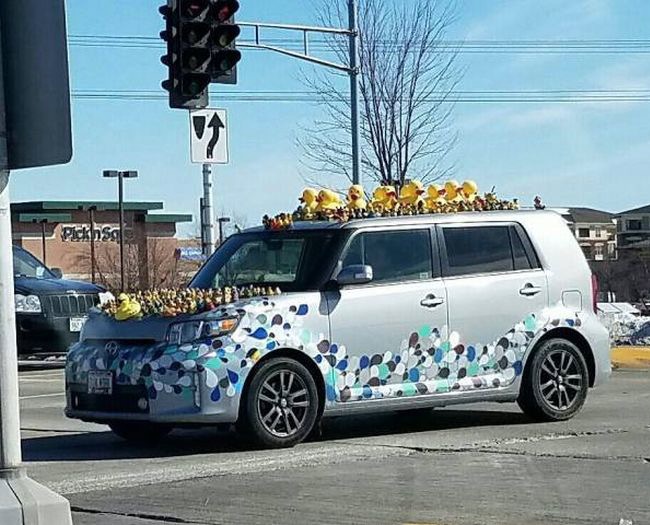 Buy a dozen rubber ducks from Walmart and get another dozen free. Rather than put them in your tub you can glue them to your car.