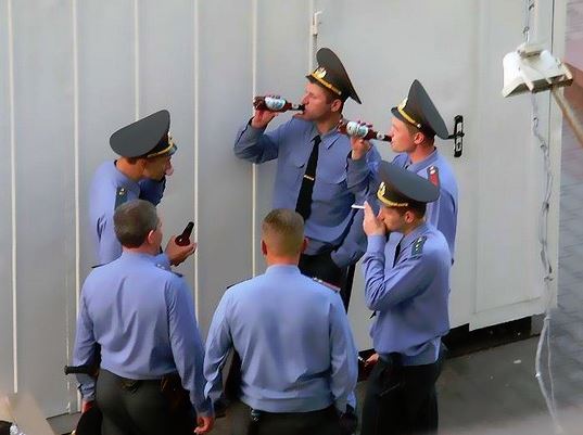 This is a typical daily break for these russian police officers, "Oh nothing much Victor just having a beer."