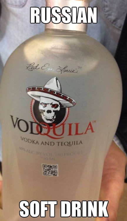 Take a look at this drink. It's called Vodquila. My guess is that it's a mixture of vodka and tequila. The average man would shudder at the thought of this drink. The average Russian, however, considers this a mere softdrink.