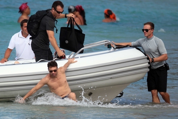Ryan Seacrest splashed down hard while unboarding a small boat. It looks like he is ok but a little shocked that he lost his footing and fell down in the water.