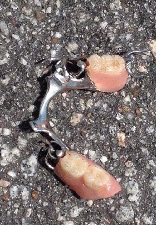 I guess this popped out of somebody's mouth and got run over? Poor pop going to need another set of dentures. They are not cheap!