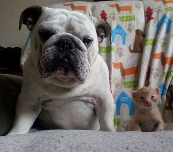 Say Hello To My Little Friend. Bulldog and Kitten....Too Cute!