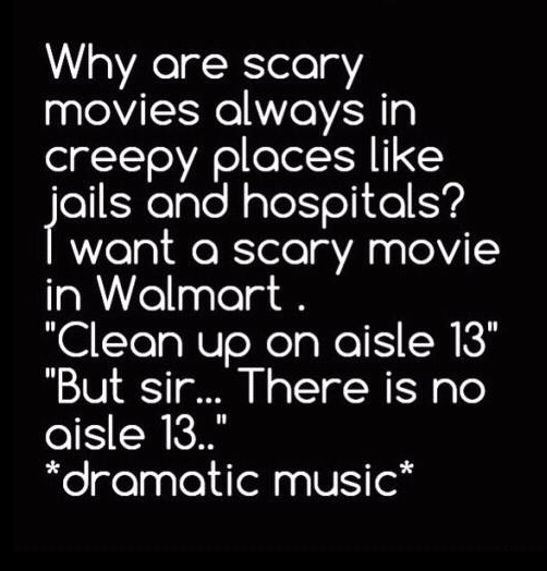 Why are scary movies always in creepy places like jails and hospitals? I want a scary movie in Walmart. "clean up on aisle 13" "But sir.... There is no aisle 13.." *DRAMATIC MUSIC*