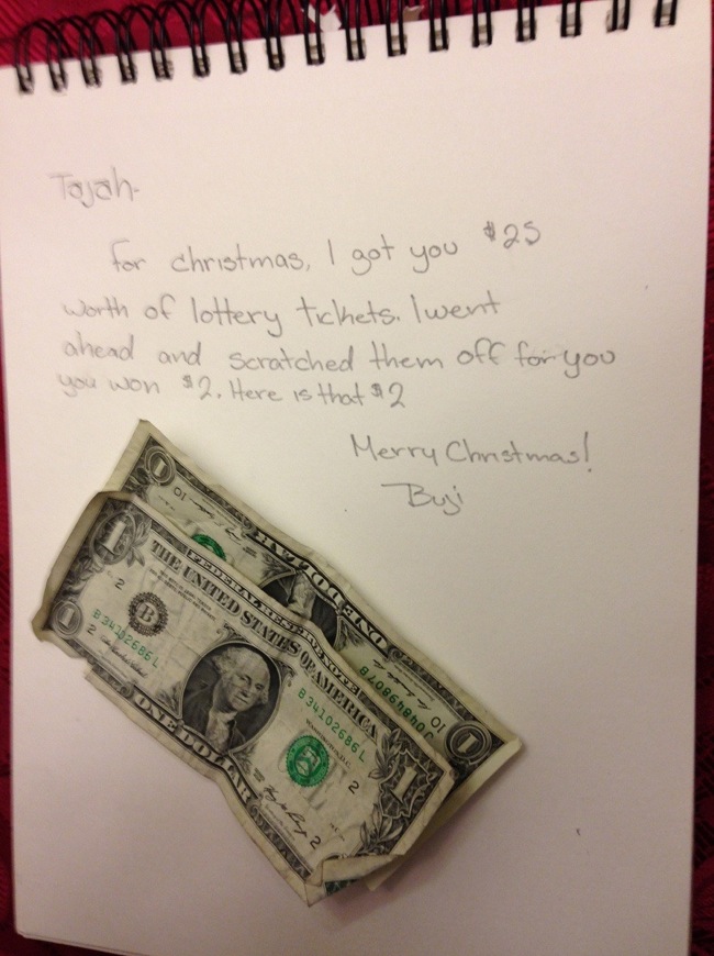 I got you $25 worth of lottery tickets. I went ahead and scratched them off for you. Won $2. Here is that $2. Scratchers are the worst gift. Unless they're back scratchers. Then they're the best!