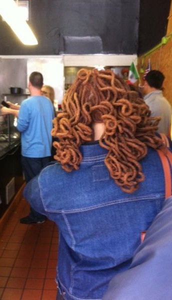 I don't know what to make of this hair. I wonder if I should laugh or get some ketchup and start eating. That is a really strange hairdo.
