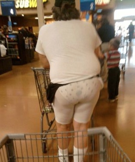 Not sure if this person realizes that the biker shorts are see through but the polka dots on those underwear are a really nice touch. Great job dressing in the morning