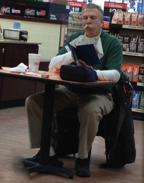 Seriously? Sophisticated Man with Mustache & Bib Reads Book & Eats at Walmart
