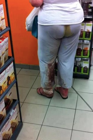 I think a fart went very badly for this woman. What seemingly appeared to be a fart came out as a huge stream of shit. Cleanup on aisle seven and bring a hose!