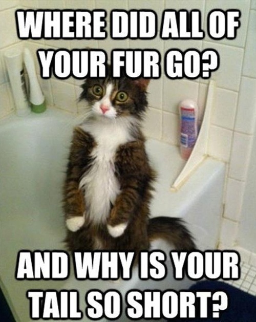 Where did all of your fur go? And why is your tail so short? This surprised kitty is on the bathtub ledge wondering why you look so funny.