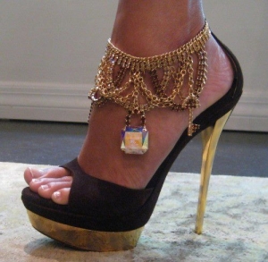 The anklet looks like a charm bracelet. Little charms are dangling off of this shoe. Exquisite.