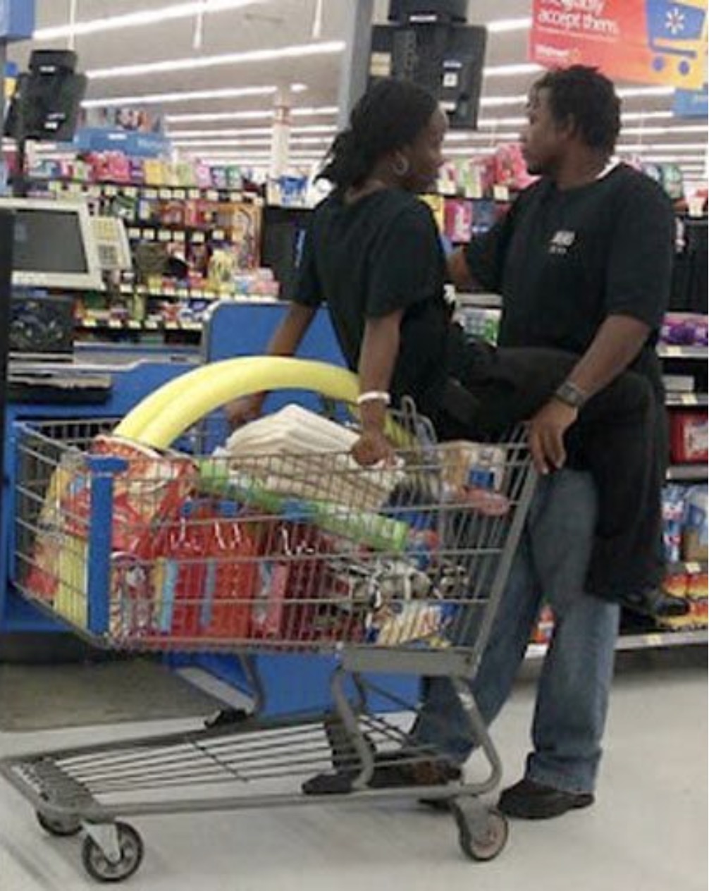 These two should get a room together instead of riding around in a shopping cart. The shopping cart needs a door to close.