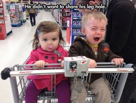 Shopping Cart Sharing Crying Boy Doesn't Like Sharing Leg Holes with Baby Sister