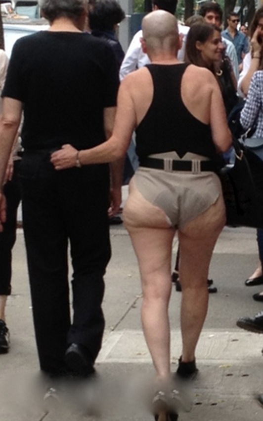 This girl is really going for it in the fashion department. A double whammy is bound to turn heads...away! I guess her shorts were so short she peed in her pants from excitement.