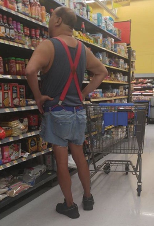 Walmart is cracking down on butt cracks and offering free suspenders even to people with shorts. This guy has no butt so his shorts would have fallen right to the ground.